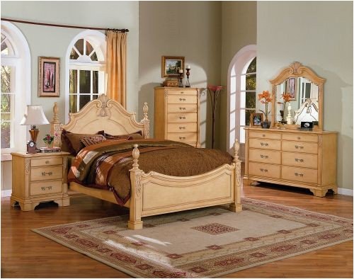Grand in design our eastern king size bedroom set features a beautiful cream finish. The headboard is arched with elegant scrolls and carved center design with square side posts carved at the top and large finials measuring approximately 60 inches high. The footboard is lower with matching side posts and finials with a solid center board outlined and scrolled measuring approximately 37 inches high. The nightstand has two large drawers and a narrow one with metal hardware measuring approximately 28 x 18 x 28 inches high. The chest of drawers has seven drawers and measures approximately 38 x 18 x 54 inches high with the dresser having eight drawers measuring approximately 64 x 18 x 38 inches high and the matching mirror measures approximately 42 x 44 inches high. Mattress and bedding not included.